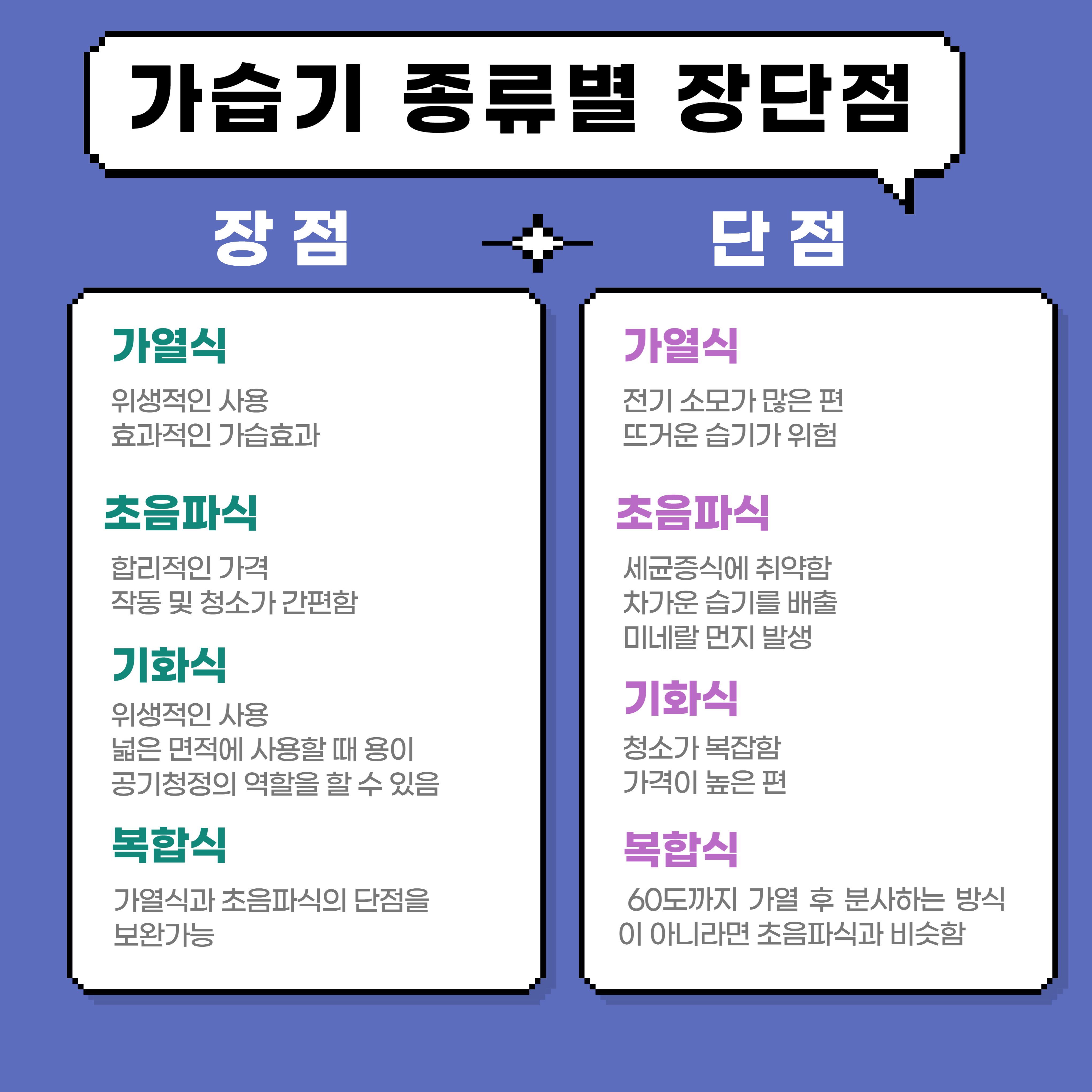 가열식 가습기는 가습기 내부에서 물을 끓여 그 수증기를 공기 중으로 방출하는 방식입니다. 초음파식 가습기는 초음파 진동을 이용하여 아주 작게 나눠진 미세한 물분자들을 공기 중으로 방출하는 방식입니다. 기화식 가습기는 가습기 내부에 설치돼 있는 디스크를 사용하여 팬을 돌려 습기를 밖으로 내보내는 방식입니다. 복합식은 가열식과 초음파식을 합쳐진 가습기입니다.