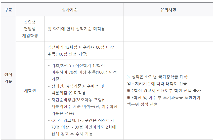 ▶ 신입생, 편입생, 재입학생은 첫 학기에 한해 성적기준 미적